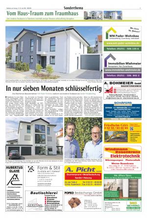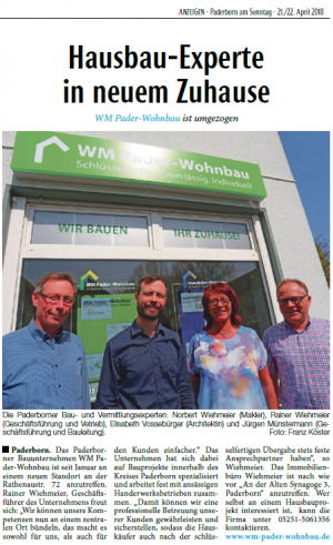 Wer sich einmal unverbindlich zum Bau eines Eigenheims beraten lassen will, der findet das Team der WM Pader-Wohnbau GmbH, An der Alten Synagoge 3, 33098 Paderborn oder unter Tel. 05251-5061356, info@wm-pader-hausbau.de und online: www.wm-pader-hausbau.de