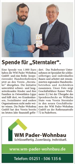 Eine Spende von 1.000 Euro haben die WM Pader-Wohnbau GmbH und eine Reihe kooperierender Handwerksfirmen jetzt an den Verein „Sterntaler“ übergeben. Die Initiative unterstützt schwer- und langzeiterkrankte Kinder und ihre Familien in Ostwestfalen-Lippe und hilft dort, wo Krankenkassen, Sozialämter und andere Organisationen nicht mehr weiterwissen. Die Pader-Wohnbau GmbH hat den Verein bereits im letzten Jahr finanziell gefördert.