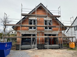 Auf einem Restgrundstück am Ende eines Wendehammers errichten wir aktuell zwei wunderschöne Doppelhaushälften in versetzter Bauweise. Bei guter Witterung geht der Baufortschritt zügig voran. Fertigstellung: Anfang 2024.